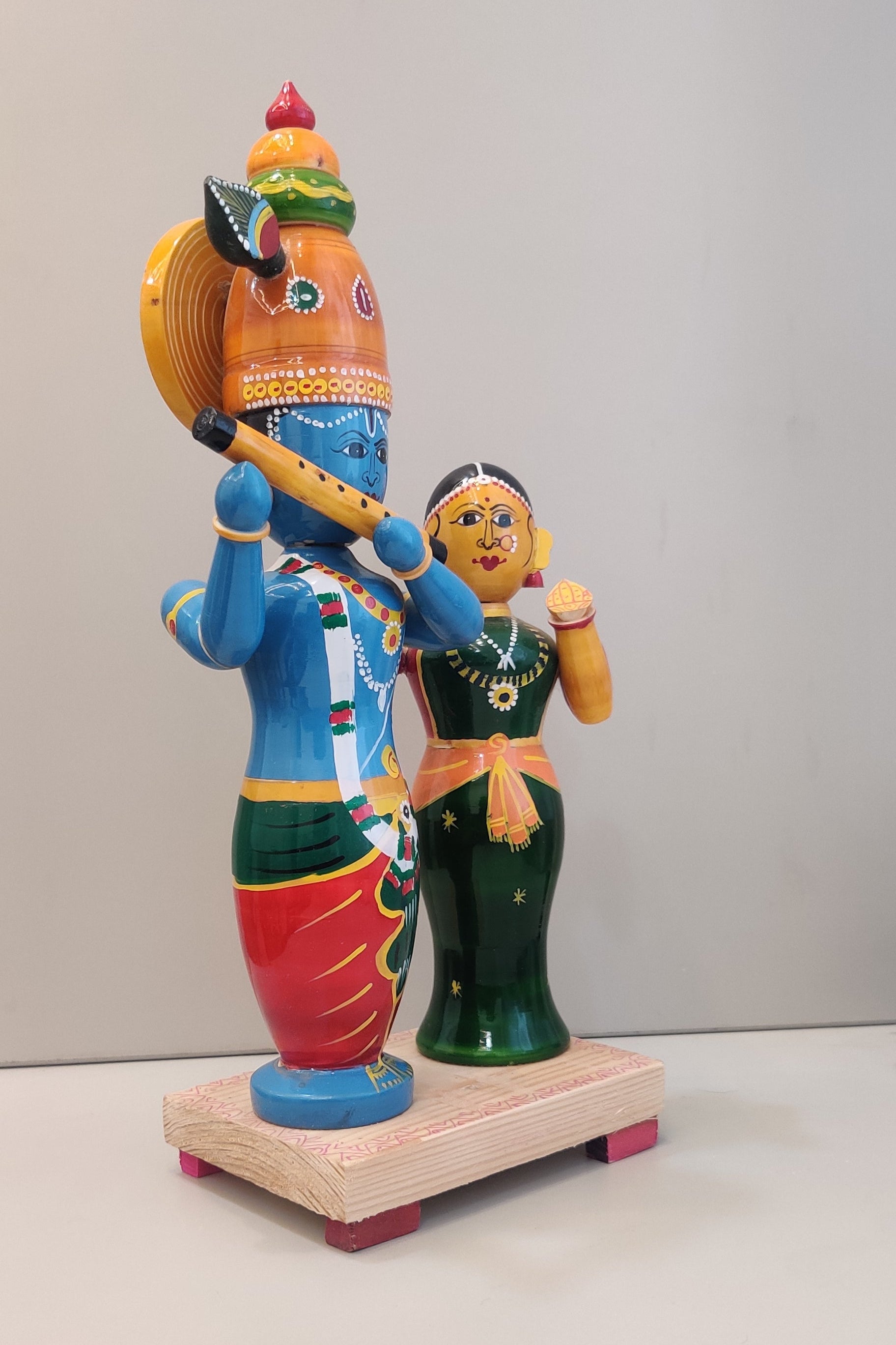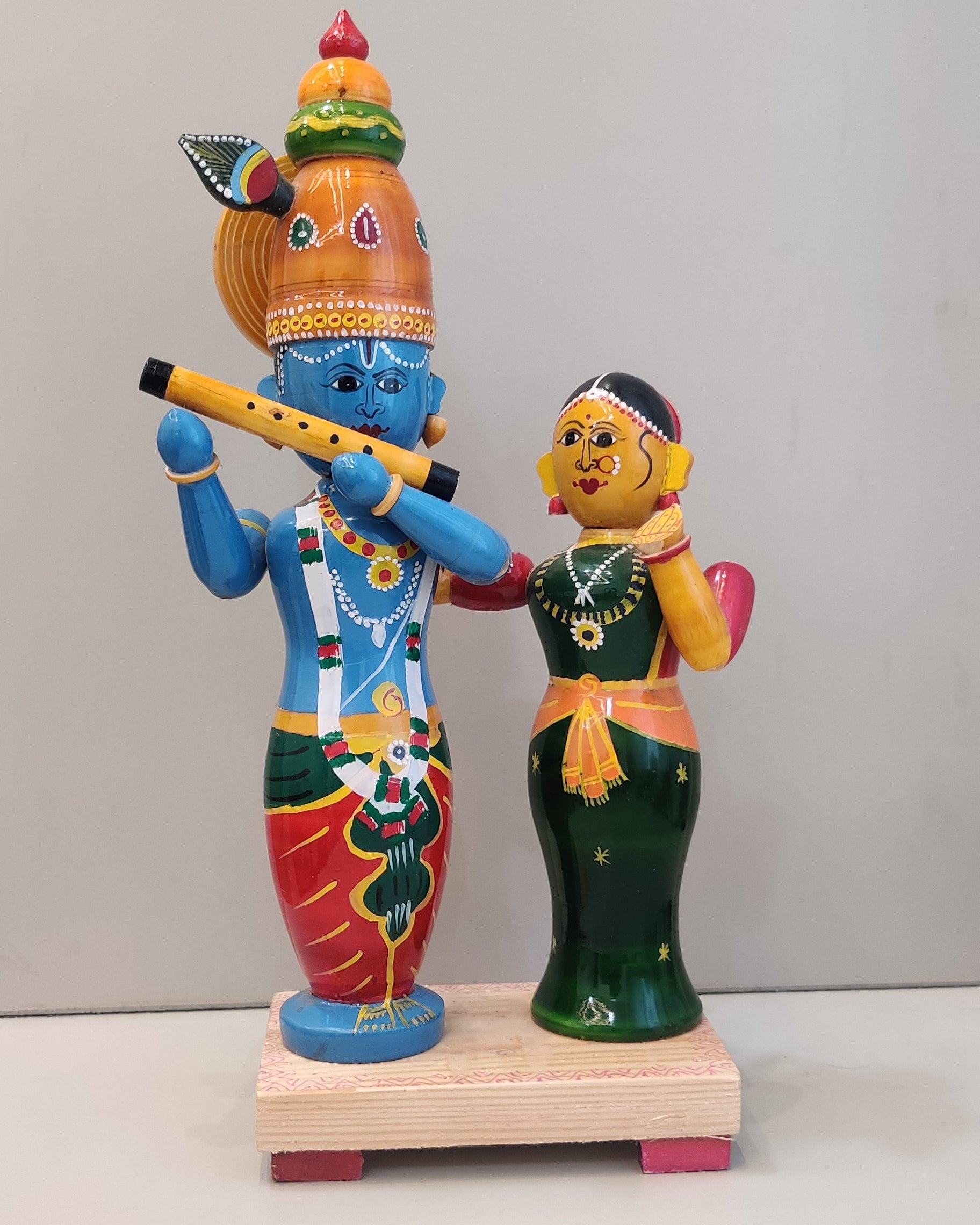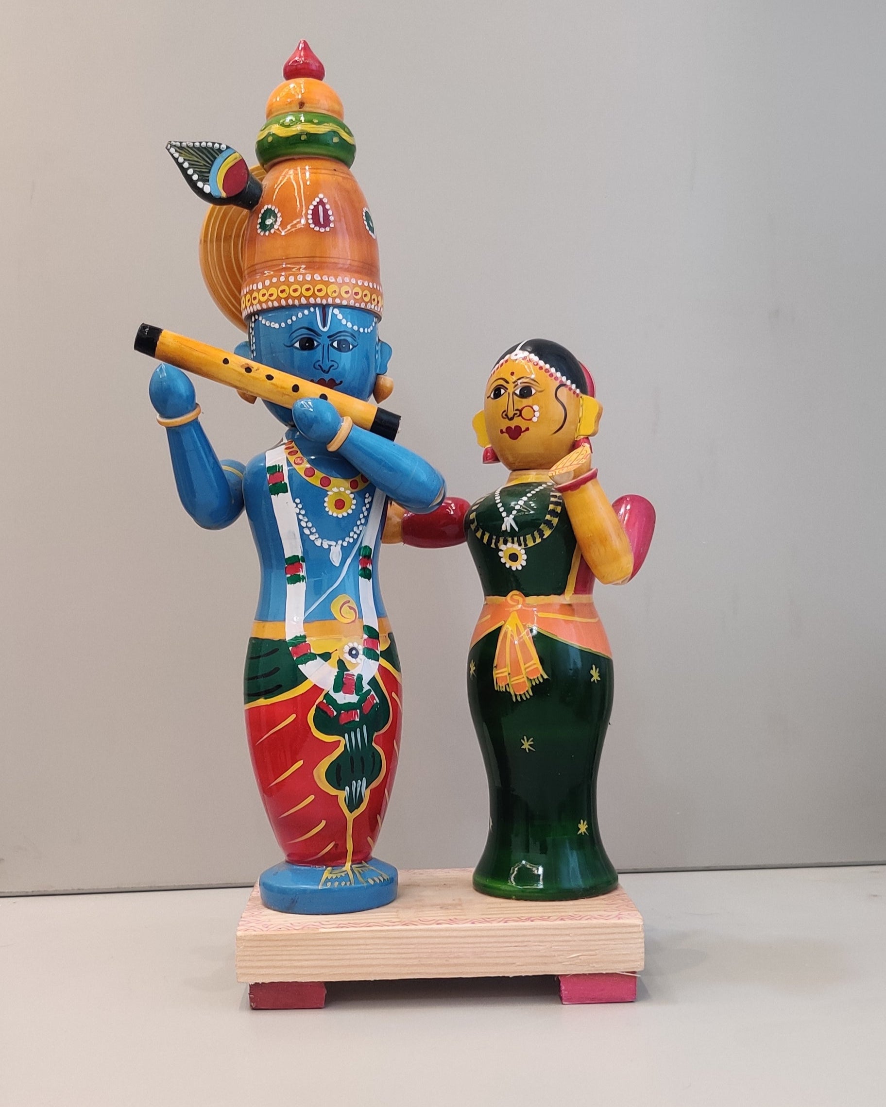 This is a colorful Etikoppaka wooden lacquerware sculpture depicting Lord Krishna and Radha in a charming, folk-art style.