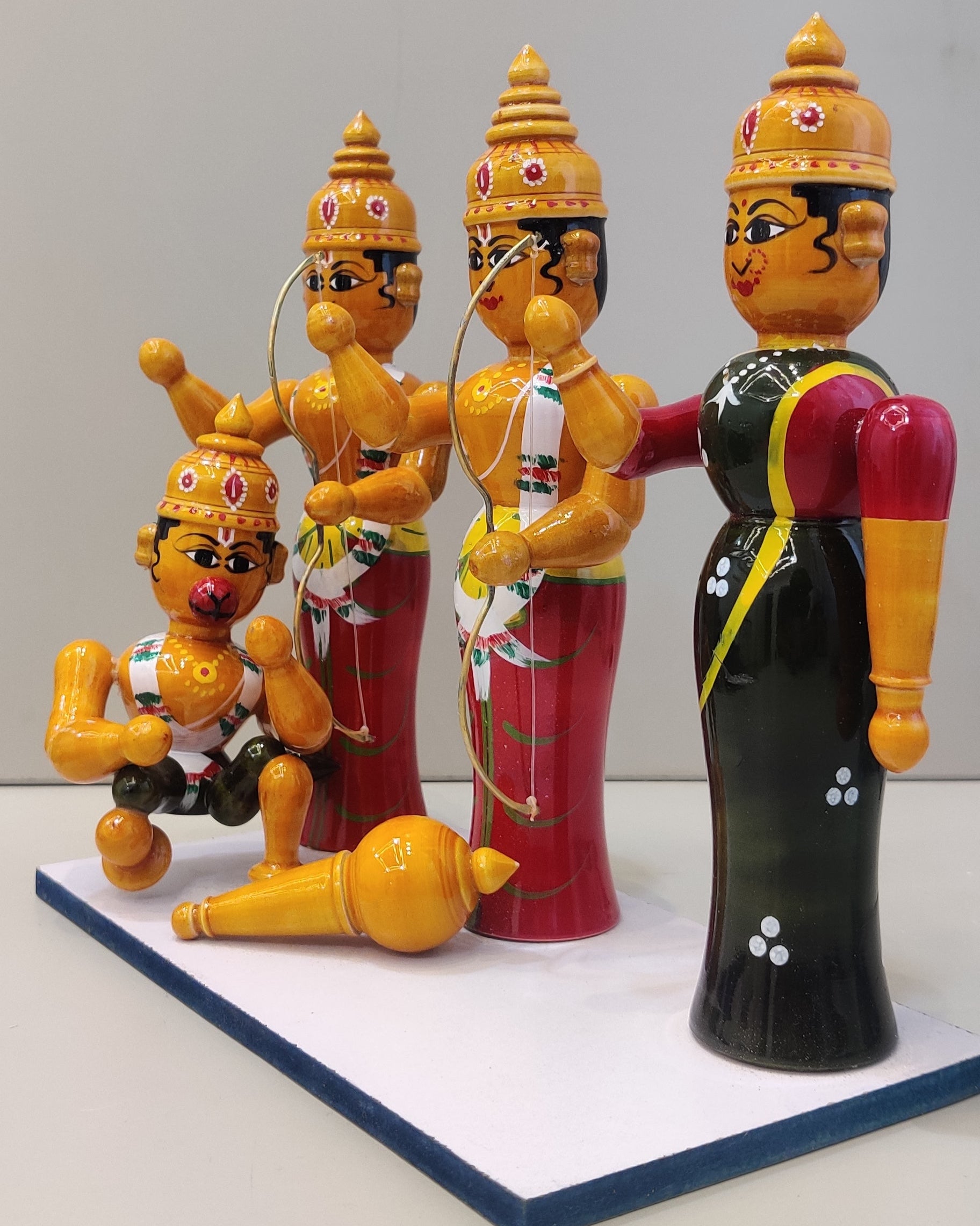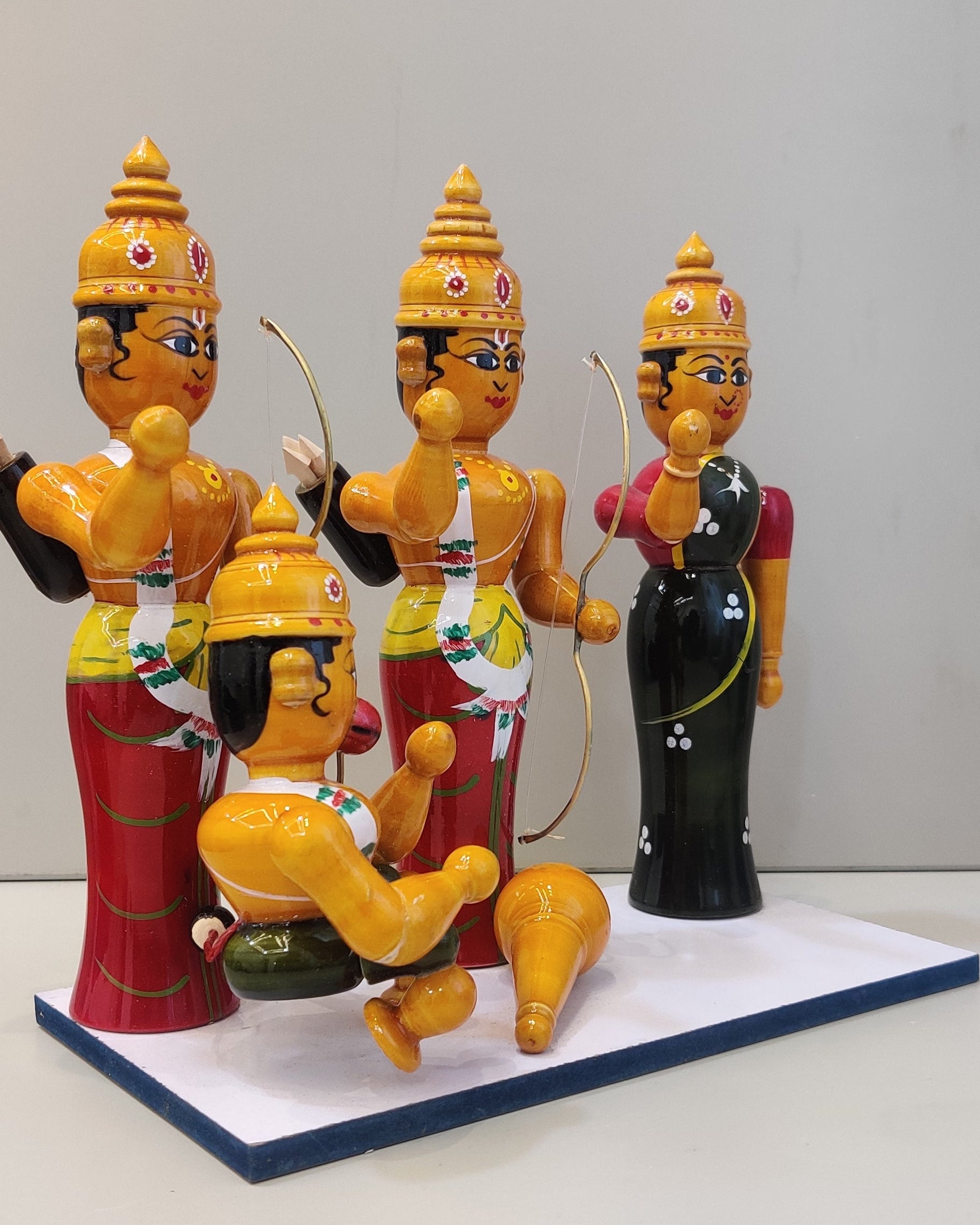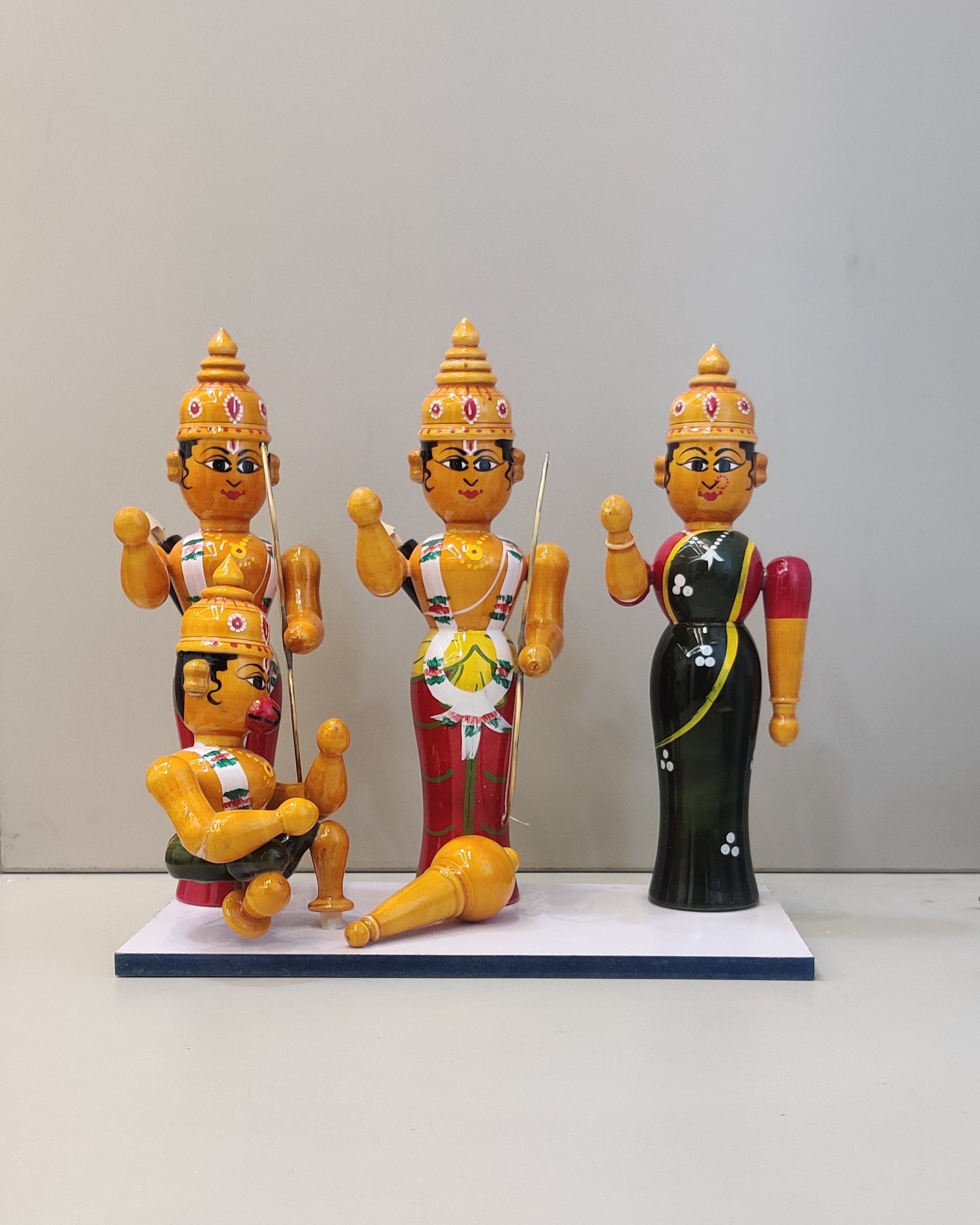 Celebrate the grandeur of Sita Rama Pattabhishekam with this beautifully handcrafted Etikoppaka wooden figurine set. Depicting the coronation of Lord Rama as the king of Ayodhya, the set includes:
